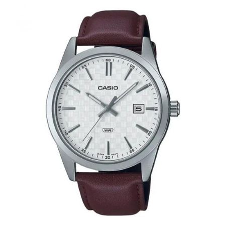 The CASIO Men Watch MTP-VD03L-5AUDF is a sleek and stylish timepiece that will elevate any outfit. It features a dark brown leather strap with a stainless steel case, creating a classic and timeless look. The dial is made in such a way that you can always see the time on it, its shape is comfortable, elegant and pleasing to your eye. Not only does this watch look stylish, but it also offers reliable timekeeping with its precise movement. It also has a water resistance, making it suitable for everyday wear. The bracelet will sit nicely on your wrist and perfectly complement your watch, highlighting your sense of taste. The Watch is designed with both fashion and functionality in mind. They has a scratch-resistant mineral glass to protect the dial from any accidental damage. This watch is perfect for you who appreciate luxury and quality. It comes in a beautiful package, making it an ideal gift for yourself or a loved one. Elevate your style with this Watch.