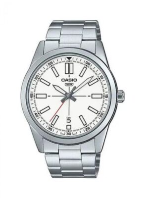 The CASIO Mens Stainless Steel Analog Watch MTP-VD02D-7EUDF is a stylish and versatile timepiece designed for the modern man. The watch features a stainless steel case with a sleek white dial, complemented by silver-tone hands and hour markers, creating a clean and sophisticated look. The dial is made in such a way that you can always see the time on it, its shape is comfortable, elegant and pleasing to your eye. Not only does this watch look stylish, but it also offers reliable timekeeping with its precise movement. It also has a water resistance, making it suitable for everyday wear. The bracelet will sit nicely on your wrist and perfectly complement your watch, highlighting your sense of taste. The Watch is designed with both fashion and functionality in mind. They has a scratch-resistant mineral glass to protect the dial from any accidental damage. This watch is perfect for you who appreciate luxury and quality. It comes in a beautiful package, making it an ideal gift for yourself or a loved one. Elevate your style with this Watch.