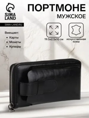 Портмоне мужское на молнии, отдел для телефона, карт, монет, цвет чёрный