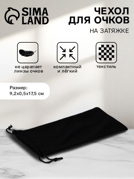 Чехол для очков на затяжке, длина 17.5 см, плотность 230 г/м², черный. Чехол для очков — элегантное и практичное решение для защиты ваших очков. Лаконичный черный цвет и длина 17,5 см делают его универсальным аксессуаром, который легко поместится в вашей сумке. Чехол выполнен из текстиля с плотностью 230 г/м², что обеспечивает надежную защиту без утяжеления. Простая застежка на затяжке гарантирует легкость и удобство использования. Подходит для женщин, которые ценят стиль и функциональность. <b> Преимущества</b> <ul> <li> Эргономичный дизайн позволяет удобно держать чехол даже в небольших женских сумках.</li> <li> Высокая плотность материала обеспечивает долговечность и защиту от царапин и пыли.</li> <li> Легкий и компактный, идеален для повседневного использования и путешествий.</li> <li> Завязки надежно фиксируют очки, не позволяя им выпасть при движении.</li> <li> Подходит для любых очков, от стильных солнечных до строгих офисных.</li> <li> Простой уход: материал легко чистится и быстро сохнет.</li> </ul>