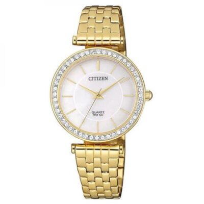 The Citizen Chic Gold Stainless Steel Analog Watch For Women ER0212-50D is a stunning and elegant timepiece that will elevate any outfit. The watch features a 28mm round gold-tone stainless steel case, giving it a luxurious and sophisticated look. The dial is Equipped clearly visible elements, creating a sleek and timeless look. Powered by a reliable quartz movement, this watch ensures accurate and precise timekeeping. The dial makes it easy to read the time at a glance, while the durable mineral crystal protects the dial from scratches and damage. The band a touch of elegance to the watch. It has reliable clasp with, providing and comfortable fit on the wrist.