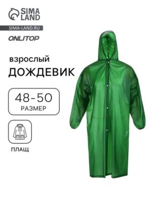 Дождевик защищает одежду от дождя. Помогает освободить руки — не нужно брать с собой зонтик. В сложенном виде он занимает мало места и легко помещается в рюкзак или сумку.Размеры:длина по спине: 107 см;ширина в области груди: 60 см;длина рукава по внутреннему шву: 50 см.