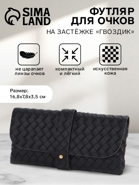 Футляр для очков на гвоздике, длина 16.8 см, черный. Футляр для очков отличается лаконичным дизайном и практичностью. Выполненный из качественной искусственной кожи, он станет великолепным и стильным аксессуаром для любой женщины. Его классический черный цвет подходит под любой стиль. Удобная застежка на гвоздике обеспечивает надежное хранение ваших очков. Идеально подходит для бережного хранения аксессуаров длиной до 16,8 см и шириной до 7,8 см. Порадуйте себя стильным решением! <b> Преимущества</b> <ul> <li> Компактные размеры позволяют легко носить футляр в сумке.</li> <li> Искусственная кожа устойчива к мелким повреждениям, обеспечивая долговечность аксессуара.</li> <li> Эргономичная форма для удобного использования в любой ситуации.</li> <li> Легкий вес делает его незаметным и легким.</li> <li> Застежка на гвоздике — простое и надежное решение.</li> <li> Подходит для любого повседневного образа.</li> <li> Отсутствие жесткого корпуса придает гибкость в использовании и хранении.</li> <li> Легкий уход: легко очищается при помощи влажной салфетки.</li> </ul> Практичный и изысканный, футляр для очков создан для тех, кто ценит качество и стиль по доступной цене. Защитите свои очки с уверенным выбором. Надежное решение, которое подчеркнет ваш индивидуальный стиль. Позаботьтесь о безопасности ваших аксессуаров уже сейчас!