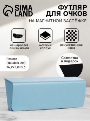 Футляр для очков на магните, длина 16.2 см, голубой. Футляр для очков выполнен из искусственной кожи и предназначен для женщин. Голубой цвет корпуса придаст вашему аксессуару стильный вид, подчеркивая вашу индивидуальность. Длина 16,2 см и ширина 5,8 см идеально подойдут для большинства стандартных оправ. Футляр оснащен магнитной застежкой, что делает его удобным в использовании. Жесткий корпус обезопасит ваши очки от повреждений. <b> Преимущества</b> <ul> <li> Прекрасно защищает очки от царапин и повреждений благодаря жесткому корпусу;</li> <li> Идеально подходит для ежедневного использования, легок и удобен в транспортировке;</li> <li> Долговечен, сохраняет форму и яркость цвета даже при длительной эксплуатации;</li> <li> Магнитная застежка облегчает быстрое и безопасное открытие и закрытие футляра;</li> <li> Эргономичный дизайн, который удобно помещается в сумку или рюкзак;</li> <li> Элегантный внешний вид подойдет к любой деловой или повседневной сумке;</li> <li> Простота в уходе — легко очищается без применения специальных средств.</li> </ul> Когда каждый день начинается с настоящего удобства и стиля, футляр для очков станет вашим верным спутником. Легкий, надежный и продуманный до мелочей, он подчеркнет вашу элегантность и внимание к деталям. Выберите выгодное решение для защиты своих очков и ощущения комфорта в каждом движении.