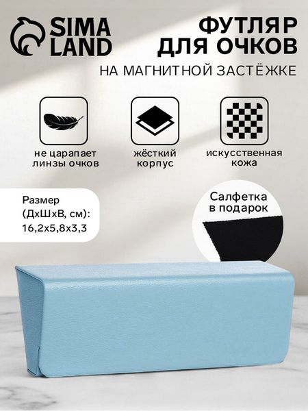 Футляр для очков выполнен из искусственной кожи и предназначен для женщин. Голубой цвет корпуса придаст вашему аксессуару стильный вид, подчёркивая вашу индивидуальность. Длина 16,2 см и ширина 5,8 см идеально подойдут для большинства стандартных оправ. Футляр оснащен магнитной застёжкой, что делает его удобным в использовании. Жёсткий корпус обезопасит ваши очки от повреждений. Преимущества Прекрасно защищает очки от царапин и повреждений благодаря жёсткому корпусу; Идеально подходит для ежедневного использования, лёгок и удобен в транспортировке; Долговечен, сохраняет форму и яркость цвета даже при длительной эксплуатации; Магнитная застёжка облегчает быстрое и безопасное открытие и закрытие футляра; Эргономичный дизайн, который удобно помещается в сумку или рюкзак; Элегантный внешний вид подойдёт к любой деловой или повседневной сумке; Простота в уходе — легко очищается без применения специальных средств. Когда каждый день начинается с настоящего удобства и стиля, футляр для очков станет вашим верным спутником. Лёгкий, надёжный и продуманный до мелочей, он подчеркнет вашу элегантность и внимание к деталям. Выберите выгодное решение для защиты своих очков и ощущения комфорта в каждом движении.