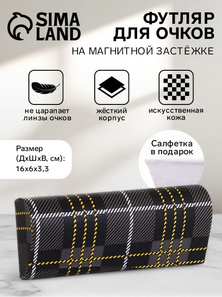 Футляр для очков на магните, длина 16 см, черный. Футляр для очков — изящное и надежное решение для современных женщин, ценящих стиль и практичность. Его черный цвет и жесткий корпус делают этот аксессуар не только элегантным, но и практичным. Длина футляра составляет 16 см, что позволяет удобно хранить большинство стандартных очков. Благодаря застежке на магните, футляр легко открывается и надежно фиксирует содержимое внутри. Выполнен из искусственной кожи, сочетающей в себе прочность и эстетическую привлекательность. <b> Преимущества</b> <ul> <li> Идеален для хранения очков в сумке или в автомобиле.</li> <li> Эргономичный и удобный дизайн для легкого использования в любой ситуации.</li> <li> Износостойкий материал обеспечивает долговечность и защиту.</li> <li> Застежка на магнит облегчает доступ и гарантирует безопасность.</li> <li> Компактный размер позволяет носить футляр в любой сумке или кармане.</li> <li> Защищает очки от царапин и повреждений благодаря жесткому корпусу.</li> <li> Современный дизайн подойдет к любому стилю.</li> </ul> Выбирайте надежные и стильные решения для защиты ваших очков каждый день. Этот футляр сочетает в себе элегантность и практичность, позволяя вам оставаться уверенными в любой ситуации. Сделайте шаг к удобству и выгоде, выбрав качество, проверенное временем.