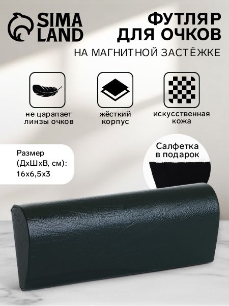 Футляр для очков на магните, однотонный, длина 16 см, темно-зеленый. Футляр для очков станет незаменимым аксессуаром для любой женщины, ценящей стиль и качество. Выполненный из искусственной кожи, он обладает жестким корпусом, что гарантирует надежную защиту ваших очков. Практичная длина 16 см и ширина 6.5 см обеспечивают универсальность, а темно-зеленый цвет придает ему элегантность. Удобная магнитная застежка делает открытие и закрытие футляра быстрым и простым. <b> Преимущества</b> <ul> <li> Идеально подходит для ежедневного использования благодаря эргономичному дизайну.</li> <li> Высокая долговечность материалов позволяет использовать футляр долгое время без потери внешнего вида.</li> <li> Магнитная застежка обеспечивает максимальную безопасность и легкость использования.</li> <li> Стильный однотонный дизайн подходит под любой наряд и аксессуары.</li> <li> Компактный размер позволяет легко носить футляр в сумке или рюкзаке.</li> <li> Жесткий корпус защищает очки от механических повреждений и царапин.</li> <li> Удобство в использовании благодаря простой и интуитивно понятной конструкции.</li> <li> Универсальность – подходит для большинства форм очков.</li> </ul> Стильный и надежный аксессуар для ваших очков, который станет частью вашего образа и подчеркнет внимание к деталям. Наслаждайтесь выгодным решением, которое не требует компромиссов между удобством и ценой.