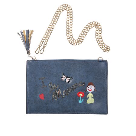 Стильный клатч-конверт из искусственной кожи модного синего цвета. Декорирован с лицевой стороны оригинальным рисунком и паетками. Застежка — молния, украшена кисточкой из искуственной кожи. В комплекте есть длинная цепочка, которая позволяет носить клатч также и на плече. Внутри одно отделение и один карман на молнии. Размер: 21 * 31см