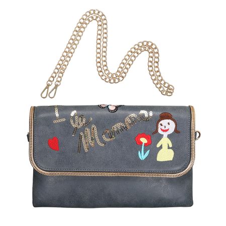 Стильный клатч-конверт из искусственной кожи модного синего цвета. Декорирован с лицевой стороны оригинальным рисунком и паетками, край обшит металлической цепью в качестве декоративного элемента. Застежка — кнопка на клапане и молния внутри. В комплекте есть длинная цепочка, которая позволяет носить клатч также и на плече. Внутри одно отделение и один карман на молнии. Размер: 18 * 29 см