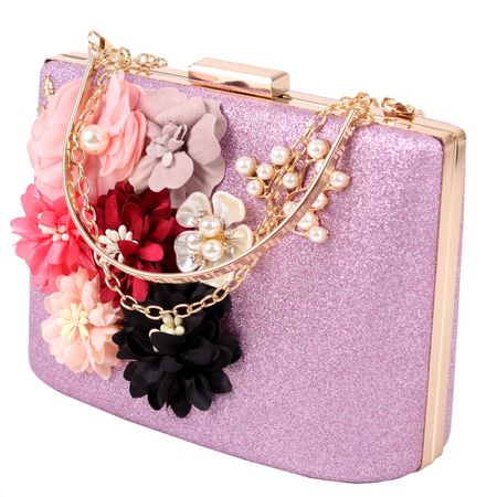 Прямоугольный фиолетовый блестящий женский клатч (маленькая сумочка), украшенный цветами. Ручка-цепь через плечо. Оттенок может меняться в зависимости от освещения. Маленькая сумка может использоваться, как для повседневной носки, так и для торжественных мероприятий.