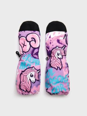Варежки детские для девочки. Утепленные варежки из мембранной ткани 5000х5000 — необходимый аксессуар для холодного времени года (осень, зима). Специальный протектор на ладонной части усиливает износостойкость изделия. Варежки имеют флисовую подкладку эластичную тесьму с карабинами, благодаря которой можно прикрепить краги друг к другу. Снегозащитная юбка. Резинка для крепления к комбинезону или к горнолужному костюму.