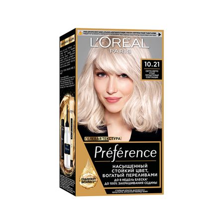Стойкая краска для волос Preference Преферанс от LOreal Paris Лореаль Париж — премиальное качество окрашивания! Она создана ведущими экспертами лабораторий Лореаль Париж в сотрудничестве с профессиональным колористом Кристофом Робином. В результате исследований был разработан уникальный состав краски, основанный на более объемных красящих пигментах. Стойкая краска способна дольше удерживаться в структуре волос, создавая неповторимый яркий цвет, устойчивый к вымыванию и возникновению тусклости. Комплекс Экстраблеск добавит блеска насыщенному цвету волос. Красивые шелковые волосы с насыщенным цветом на протяжении 8 недель после окрашивания! br /В состав упаковки входит: флакон гель-краски 60 мл, флакон-аппликатор с проявляющим кремом 60 мл, бальзам Усилитель цвета 54 мл, инструкция, пара перчаток.