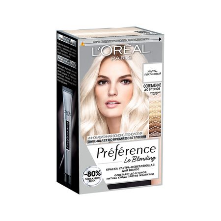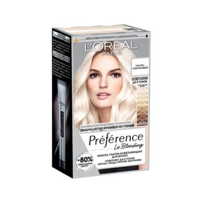 Осветлитель Preference — это осветление до 9 тонов, возможность получить чистый платиновый оттенок блонд после первого использования и укрепление волос до 5 раз. Откройте для себя инновационную осветляющую технологию от Preference. Впервые, формула, которая способна осветлить волосы до 9 оттенков вплоть до чисто платинового, даже темно-каштановый исходный оттенок. Осветлитель Preference содержит новый укрепляющий кондиционер, интенсивно питающий волосы и визуально уменьшающий повреждения. Волосы в 5 раз сильнее. Обогащён фиолетовыми пигментами для нейтрализации желтизны. br /В состав упаковки входит: флакон осветляющего крема 25 мл, флакон-аппликатор с проявляющим кремом 75 мл, саше осветляющего порошка 22 гр, укрепляющий кондиционер 54 мл, инструкция, пара перчаток.