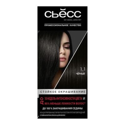 Стойкая крем-краска для волос СЬЁСС Чёрный 1_1 с концентрированными цветовыми пигментами и системой против повреждений. Пигменты красителя глубоко проникают в волокна волоса, позволяя добиться ИНТЕНСИВНОСТИ ЦВЕТА ДО 10 НЕДЕЛЬ и ПРОФЕССИОНАЛЬНОГО ЗАКРАШИВАНИЯ СЕДИНЫ. Ухаживающая технология SALONPLEX реставрирует повреждённые связи в структуре волоса и восстанавливает волосы изнутри. Формула с кератином покрывает кутикулу волос, делая их более мягкими и гладкими. Для ВИЗУАЛЬНО УЛУЧШЕННОГО КАЧЕСТВА ВОЛОС* и ДО 80 % МЕНЬШЕ ЛОМКОСТИ ВОЛОС*. Подходит для волос от каштановых до чёрных оттенков. Для волос с любым содержанием седины. Стойкое окрашивание.br /br /* по сравнению с волосами, окрашенными без применения технологии SALONPLEXbr /