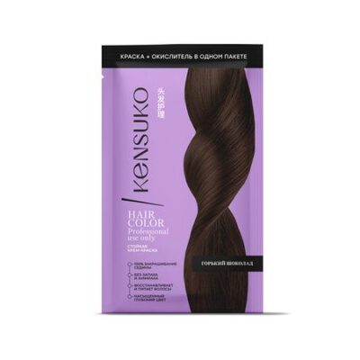 Крем-краска для волос KENSUKO тон горький шоколад полностью готова к использованию! Инновационная двухкамерная упаковка содержит краску и проявляющую эмульсию окислитель в одном пакете. Стойкая крем-краска глубоко проникает внутрь локона, питает его во время окрашивания и наполняет насыщенным цветом. Кремообразная текстура легко наносится и не течет. Входящий в состав восстанавливающий комплекс с маслом жожоба интенсивно питает, восстанавливает, придает гладкость, эластичность и объем волосам. Краска KENSUKO обеспечивает 100% закрашивание седины. Не содержит аммиак.