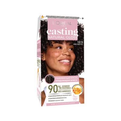 Хочешь добавить блеска естественному цвету? Попробуй блестящую новинку CASTING NATURAL GLOSS, идеальную для первого окрашивания! Новая тонирующая краска содержит 90% ингредиентов натурального происхождения, в ней нет аммиака, и она отлично подчеркнет твой натуральный цвет волос! br /br /Безаммиачная краска-уход Кастинг Натурал Глосс предназначена для тонирования и придаст волосам в 3 раза больше блеска. Естественный оттенок будет выглядеть насыщеннее и немного ярче и вернется после 28 использований шампуня.br /br /Выбирая между двух оттенков, рекомендуем остановиться на более светлом, так как после окрашивания результат может быть чуть темнее, чем на упаковке. Краска Кастинг имеет широкую палитру из 10 трендовых шоколадных оттенков, начиная от темной краски каштанового цвета, заканчивая русыми и блонд оттенками.br /Обязательно проведи аллергический тест на запястье/за ухом за 48 часов до окрашивания Кастингом Натурал Глосс. Рекомендуем использовать светлые оттенки 823 и 923 только на натуральные волосы. br /