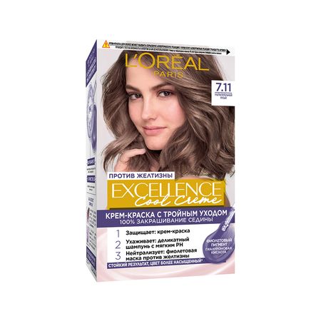 Стойкая крем-краска для волос Excellence Cool Crème – это тройной уход и 100% закрашивание седины. Excellence Cool Crème – это бренд внутри бренда! Среди продуктов коллекции Cool Crème есть ультрапепельные оттенки как для блондинок, так и для брюнеток! Тройной уход крем-краски заключается в инновационных формулах. Уход за цветом, уход за кожей головы, уход за волосами. br /1.Крем-краска защищает волосы. В уникальный состав входят: коллаген, который уплотняет волосы, керамиды, которые закрывают кутикулы и позволяют получить более долгий и стойкий результат окрашивания, технология про-кератин, которая восстанавливает повреждения волос. br /2.Фиолетовый шампунь с мягким pH не только восстанавливает кожу голову после окрашивания, но и способствует нейтрализации желтизны. br /3.Фиолетовая маска питает волосы и нейтрализует желтизну благодаря высокой концентрации фиолетовых пигментов. В состав упаковки входит: флакон крем-краски, флакон-аппликатор с проявляющим кремом, фиолетовый шампунь, фиолетовая маска, инструкция, пара перчаток.
