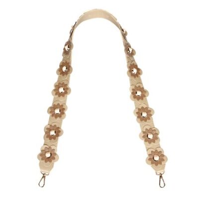 Бежевая ручка для сумки из искусственной кожи длиной 105см и шириной 5.5см в романтическом стиле — один из набирающий силу трендов. Отлично дополняет круглые сумки и клатчи, придавая оригинальности образу. Может как сочетаться с цветом сумки, так и радикально отличаться от него. Необычный длинный ремень — один из наиболее действенных способов подогнать аксессуар под себя, разнообразить сочетание универсальных деталей. Декорирована крупными цветами из искусственной кожи, завершающимися конусовидными клепками серебристого цвета.
