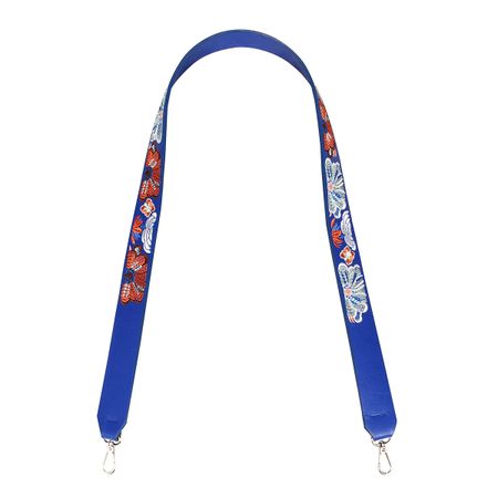 Синяя ручка для сумки с серебристыми карабинами длиной 110см и шириной 4.5см изготовлена из искусственной кожи. Длинный ремень украшен крупными, разноцветными, вышитыми гладью цветами. Дополнив любую сумку или клатч таким аксессуаром можно получить яркий акцент вашего образа, а также удобное ношение через плечо.