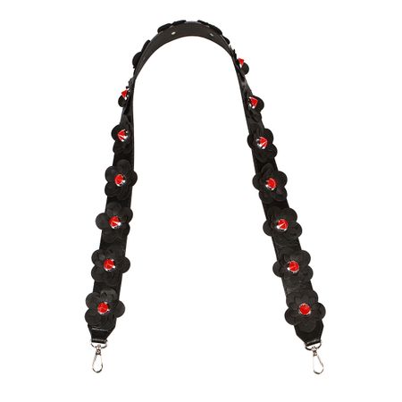 Черная ручка для сумки из искусственной кожи длиной 105см и шириной 5.5см в романтическом стиле — один из набирающий силу трендов. Отлично дополняет круглые сумки и клатчи, придавая оригинальности образу. Может как сочетаться с цветом сумки, так и радикально отличаться от него. Необычный длинный ремень — один из наиболее действенных способов подогнать аксессуар под себя, разнообразить сочетание универсальных деталей. Декорирована крупными цветами из искусственной кожи, завершающимися конусовидными клепками серебристого цвета.