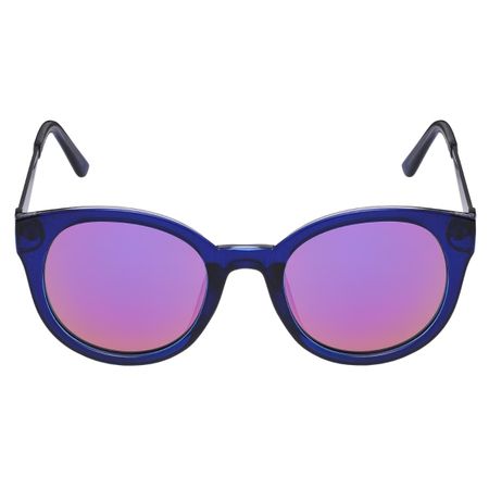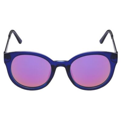 Солнцезащитные очки в прозрачной пластиковой оправе синего цвета. Стекла обеспечивают высокую защиту от UV-лучей. Металлические дужки коричневого цвета. Заушники пластиковые. Фирменный чехол прилагается.