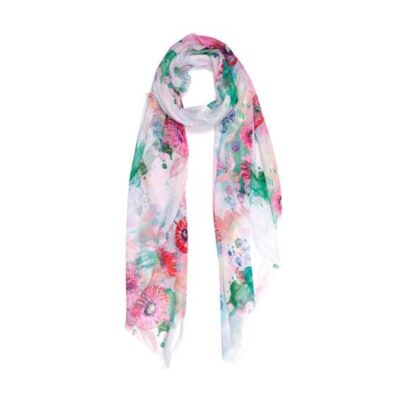 Воздушный палантин из вискозы и хлопка с растительным принтом в акварельном стиле. Как будто сама природа сотворила этот удивительный палантин! Рисунок, олицетворяющий природную красоту цветов, придется по вкусу нежным и утонченным натурам. Вы можете повязать его на шею или накинуть на плечи — фантазируйте. Материал легко драпируется.