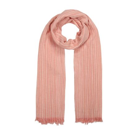 Нежно-коралловый палантин в деликатную вертикальную полоску по светлому полотну ткани "yarn dye" с эффектом крэш и длинной бахромой по краям. Чередование тонких многочисленных полос визуально акцентирует шею, а сочетать аксессуар можно как с темными, так и светлыми комплектами гардероба.