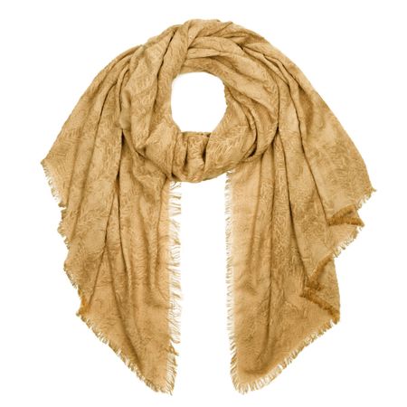 Изысканный и приятный на ощупь палантин замечательно сочетается с базовой осенней верхней одеждой и легко комбинируется с другими аксессуарами. Дизайнерский узор флоральных мотивов воплощает образ музы художника, нежной и артистичной одновременно. Красивый фон золотистого цвета окаймлен короткой бахромой для создания романтичного настроения.