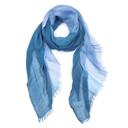 Нежный стильный палантин выполнен из сочетания нитей модал/вискоза/шелк и окрашен по технике "деграде", игре полутонов, плавном переходе от темного оттенка к светлому. Благодаря этому эффекту палантин обретает визуальное свойство невероятно облегчать силуэт и сделать фигуру стройнее и женственнее. Пастельные небесно-голубые тона позволяют добавить его в офисный гардероб и без проблем сочетать со строгой одеждой и брючными костюмами. Дополнительный шарм аксессуару придают две горизонтальные мережки и воздушная бахрома на торцевых краях изделия. Рекомендации по уходу: ручная деликатная стирка.