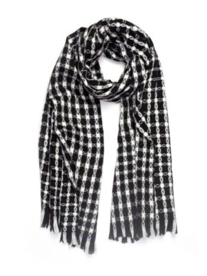 Стильный дизайнерский мягкий, теплый и невесомый палантин черного цвета с необычным клетчатым орнаментом, декорирован короткой пушистой бахромой. Великолепно дополнит любой образ и будет согревать в холода. Легко составляет комплект с однотонными вещами и другими аксессуарами. Такой универсальный аксессуар необходимая часть гардероба, позволяющая подчеркнуть стиль, имидж и даже настроение женщины. Он подойдет практически к любому образу и сделает его более выразительным, стильным и ярким. Такой аксессуар гармонично впишется как в классический стиль, в стиль Casual или в более раскрепощенный молодежный образ. Состав: 30% шерсть, 70% вискоза.