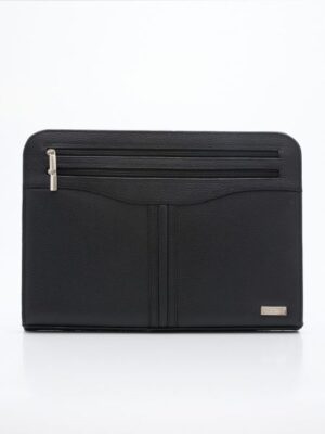 Папка имеет два отделения.Внутри на задней стенке карман на молнии.Имеется средний карман на молнии, открытый карман и карманы для канцелярии. На наружной передней стенке два кармана на молнии,на задней наружной стенке карман на молнии.Папка закрывается на молнию. Имеется ручка-петля.Материал: Натуральная кожа , Размер: 385x275x35
