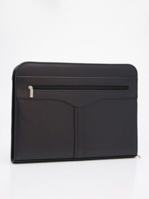 Распашная папка закрывается на молнию. Внутри спереди накладной карман. На нем прорезной карман на молнии. Внутри сзади бумагодержатель с блокнотом. Снаружи спереди прорезной карман на молнии.Материал: Натуральная кожа , Размер: 385x275x35