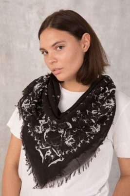 Главная » Аксессуары Платок Просмотров 4 Платок с рисунком в виде черепов дополненных цветочками. Выполнен из натурального хлопка. Декорирован бахромой со всех сторон. Модные истории