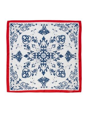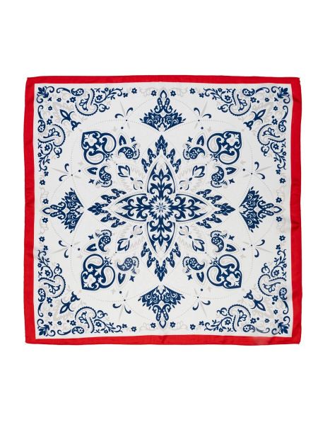 Шелковый платок с восточным принтом.<br> Этот элегантный платок выполнен из 30% шелка и 70% вискозы, что делает его невероятно мягким, приятным на ощупь и комфортным в носке. Классический восточный орнамент в насыщенных синих оттенках на белом фоне, дополненный контрастной красной каймой, создает стильный и благородный образ. Этот универсальный аксессуар можно носить различными способами – завязывать на шее, вплетать в волосы, использовать в качестве головного убора или стильного дополнения к сумке. Такой платок станет неотъемлемым элементом вашего гардероба или отличным подарком для ценителей изысканных аксессуаров.