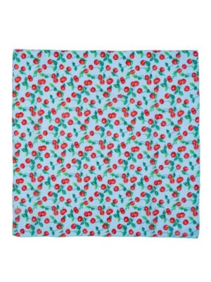 Шейный платок с принтом.<br> Легкий и стильный платок выполнен из 100% хлопка, что делает его мягким и комфортным в носке. Яркий дизайн с крупными спелыми вишнями на голубом фоне придает аксессуару свежий и жизнерадостный вид. Аккуратная обработка края подчеркивает качество изделия и его уникальность. Этот универсальный аксессуар можно носить разными способами – завязывать на шее, в волосах, использовать в качестве головного убора или декора для сумки. Такой платок станет прекрасным дополнением к летнему гардеробу или оригинальным подарком для любителей стильных акцентов.