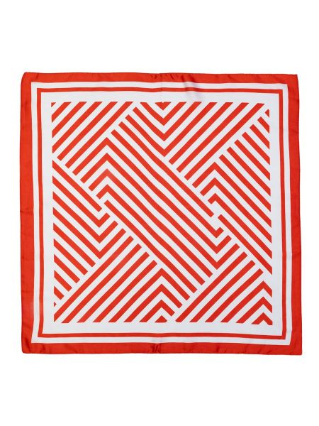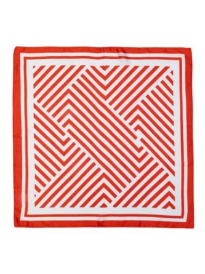 Шелковый платок с геометрическим принтом. <br> Этот утонченный платок выполнен из 30% шелка и 70% вискозы, что делает его невероятно мягким, легким и комфортным в носке. Геометрический узор с четкими красными линиями на белом фоне придает аксессуару современный и динамичный вид, подчеркивая его стильную простоту. Этот универсальный аксессуар можно носить различными способами – завязывать на шее, использовать в качестве головного убора или стильного дополнения к сумке. Такой платок станет отличным акцентом в гардеробе или подарком для ценителей модных и оригинальных аксессуаров.