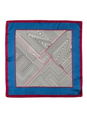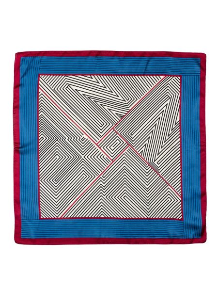 Шелковый платок с геометрическим принтом.<br> Этот стильный платок выполнен из 30% шелка и 70% вискозы, что делает его невероятно мягким, легким и комфортным в носке. Геометрический узор с тонкими линиями и контрастными полосами в глубоких оттенках синего и бордового придает аксессуару динамику и современный вид. Этот универсальный аксессуар можно носить различными способами – завязывать на шее, вплетать в волосы, использовать в качестве головного убора или декорировать сумку. Такой платок станет выразительным акцентом вашего образа или отличным подарком для любителей модных аксессуаров.