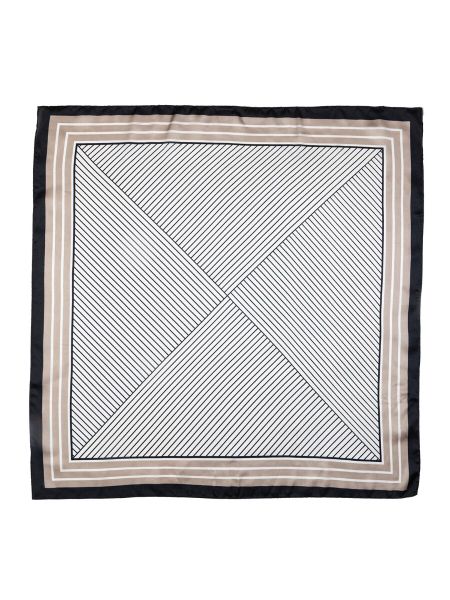 Шелковый платок с геометрическим принтом.<br> Этот утонченный платок выполнен из 30% шелка и 70% вискозы, что делает его невероятно мягким, легким и комфортным в носке. Элегантные тонкие полосы, дополненные контрастной черной каймой, создают стильный и лаконичный дизайн, подходящий как для деловых, так и для повседневных образов. Этот универсальный аксессуар можно носить различными способами – завязывать на шее, вплетать в волосы, использовать в качестве головного убора или стильного дополнения к сумке. Такой платок станет отличным выбором для тех, кто предпочитает классические узоры и утонченный стиль.