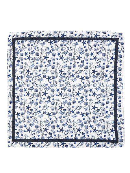 Шелковый платок с морским принтом. Этот элегантный платок выполнен из 30% шелка и 70% вискозы, что делает его невероятно мягким и комфортным в носке. Легкий морской принт с ракушками, звездами и морскими узорами на светлом фоне придает аксессуару свежий и стильный вид. Темно-синяя кайма завершает дизайн и добавляет контрастности. Этот универсальный аксессуар можно носить различными способами – завязывать на шее, использовать в качестве головного убора или стильного дополнения к сумке. Такой платок станет прекрасным элементом летнего гардероба или оригинальным подарком для ценителей морской тематики.