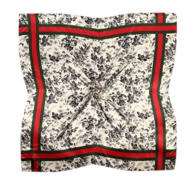 Главная » Аксессуары Платок Просмотров 4 Романтичный платок с принтом в виде темно-серого орнамента тропической флоры по светлому полю, окаймленного полоской "райе" красно-зеленого цвета. Модные истории