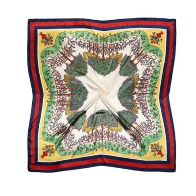Главная » Аксессуары Платок Просмотров 3 Яркий платок с сочным принтом на белом фоне. Растительный мелкий узор в виде яблоневой рощи посреди цветочной поляны. Геометрический кант. Модные истории