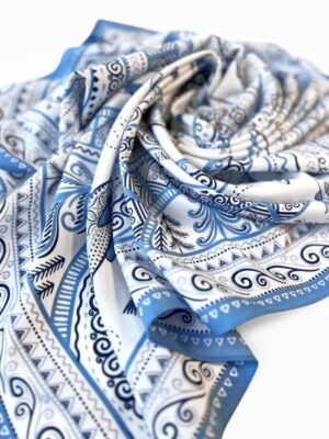 <div>В Архангельской области и на территории Коми протекает река Мезень, впадающая в воды Белого моря. Она щедро кормила северные народы рыбой, и была источником вдохновения талантливых мастеров «Мезенской росписи». Эта роспись считается зашифрованным посланием, где каждый символ имеет свое значение. Платок из коллекции бренда "Русские в моде" посвящен уникальному искусству этой росписи. Изображения спиралевидных орнаментов в виде волн, елочек, рыбок украшают дизайн. Все это означает плодородие стихий земли и воды, энергию солнца, богатство и процветание. Сегодня мезенская роспись — это современный мотив модного аксессуара от Нины Ручкиной. Изящное шелковое полотно платка, как воды реки-кормилицы, окутает ваш образ нежностью и элегантностью, многократно усилит его красоту и очарование. Пусть наша новинка станет вашим оберегом, символом удачи и преумножения благ! <br>Состав: Искусственный шелк 70%, вискоза 30%</div>