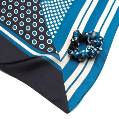 Комплект платок из вискозы и шелка с резинкой выполнен в трендовом принте "горошек" с добавлением геометрического узора по краям. Контрастное сочетание небесно голубого и глубокого синего цветов создает освежающий эффект и несомненно украсит ваш повседневный образ! Аксессуар можно носить как головной убор, использовать как украшение для волос, носить на шее и даже на ручке сумки. Рекомендации по уходу: ручная деликатная стирка.