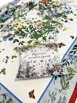 <div>Яркое благоухающее разноцветье русского полевого букета воплощено в шелковом платке, где собраны и изображены более 20 цветов и трав. <br> <br>Чудесные незабудки и ромашки, нежные васильки, пышный клевер образуют полукруг венка с вплетенными листьями лавра, чабреца, мяты. Пудровый тон фона создает ощущение простора и воздуха, а контрастная окантовка делает драпировку платка особенно эффектной.<br> <br>Красноречивее слов, цветы способны рассказать о многих чувствах! <br> <br>Над дизайном работали: Нина Ручкина, Ксения Ковражкина.<br><br>Состав: 70% шелк, 30% вискоза.</div>