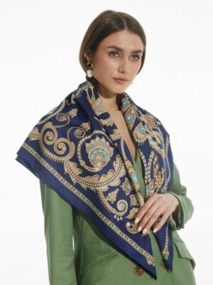 <div>Платок «Русское золотное шитье» посвящен драгоценному старинному русскому рукоделию. Дошедшие до нас памятники шитья, выполненные русскими мастерицами, являются произведениями высокой культуры. В изделиях сочетаются талант художника и тонкий вкус, духовное богатство, исполнительское мастерство вышивальщиц. В центре композиции излюбленный сюжет традиционного русского орнамента — царственные павлины. Они горделиво восседают в обрамлении из фантастических цветов и виноградных лоз. Павлин в русской культуре — это жар-птица, которая несет в себе солнечную энергию развития, поэтому это птица семейного счастья. Они всегда рассаживаются на свадебных рушниках. Павлин за красоту своих перьев стал символом расцвета, молодости. Про стройную, красиво одетую девушку говорят: «Будто пава плывет». Мы старались воссоздать в рисунке сложную фактуру древнего промысла, придав золотошвейному искусству новую форму. Желаем всем обладательницам платка «Русское золотное шитье» наполниться энергией и теплом посланий предков. А изысканная цветовая гамма платка сделает этот аксессуар незаменимым в гардеробе любой леди, неравнодушной к современной моде. <br>Состав: Искусственный шелк 70%, вискоза 30%</div>