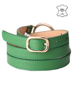 Узкий ремень зеленого цвета из натуральной кожи с золотистой фурнитурой отлично подходят для платьев, юбок, брюк, для джинсов и блузок. Аксессуар украшен крупным металлическим декоративным кольцом. С помощью такого ремня вы эффектно подчеркнете достоинства своей фигуры.