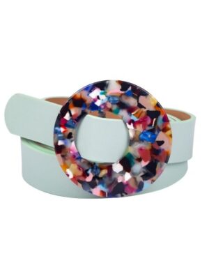 Стильный аксессуар зеленого цвета из эко кожи с ассиметричной разноцветной пряжкой. Цвета застежки станут отличным стилистическим решением при выборе цветовой палитры, чтобы сделать образ законченным и гармоничным. Щелевая пряжка позволяет легко отрегулировать размер под любую фигуру.