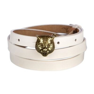 Главная » Аксессуары Ремень Просмотров 6 Яркий, тонкий ремень из натуральной кожи. Цвет белый. Пряжка в виде головы леопарда оттенка состаренного золота. Имеется кожаная шлейка. Модные истории