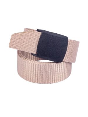 Актуальный повседневный текстильный ремень кремового цвета с пластиковой пряжкой. Благодаря застежке-зажиму ремень можно легко отрегулировать под необходимый размер.