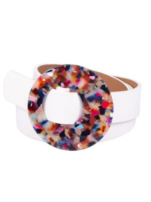 Стильный аксессуар белого цвета из эко кожи с ассиметричной разноцветной пряжкой. Цвета застежки станут отличным стилистическим решением при выборе цветовой палитры, чтобы сделать образ законченным и гармоничным. Щелевая пряжка позволяет легко отрегулировать размер под любую фигуру.